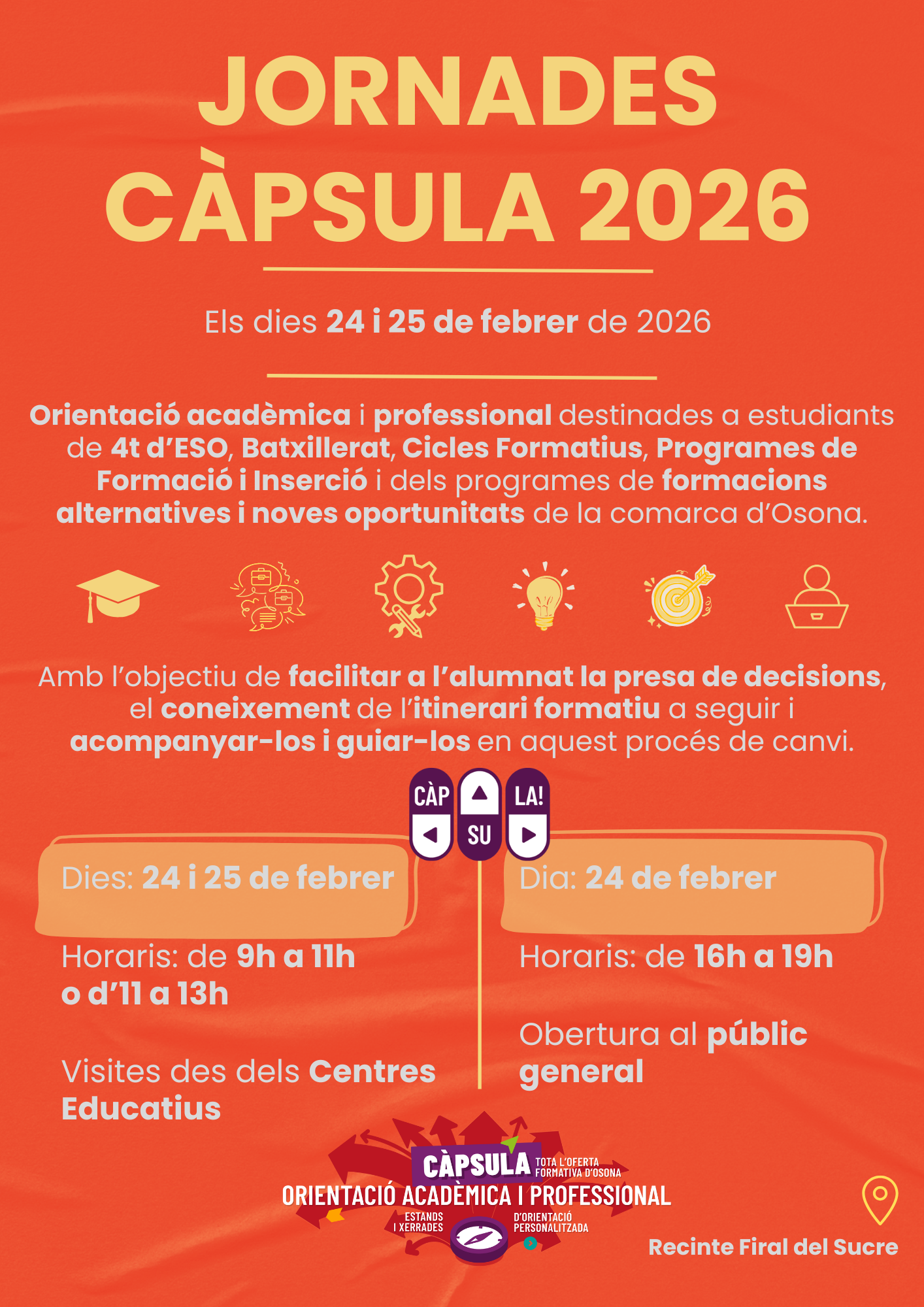 A més de l’oferta presencial, la pàgina web de Càpsula [osonajove.cat/capsula] es mantindrà activa i actualitzada durant tot l’any, oferint recursos útils per a l’orientació acadèmica i professional a la comarca.